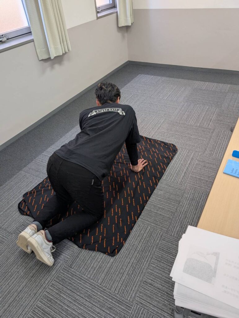 実際に側湾のスクリーニング方法として、両手を合わせて前に屈んでもらい、後方から背骨、肋骨の高さを専用の器具を使い測る方法を実習しました。